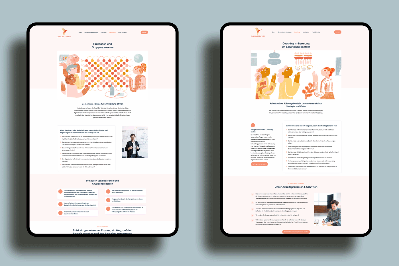 Um der Website den gewünschten persönlichen und unkonventionellen Anstrich zu verleihen, habe ich Franziska Uhlig ins Team geholt. Nach einigen Gespräche mit Silke Stahn hat sie, passend zur CI, verschiedene Visuals erstellt, welche die Arbeitsweise von Silke Stahn auf besondere Art veranschaulichen.